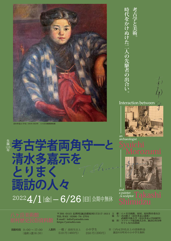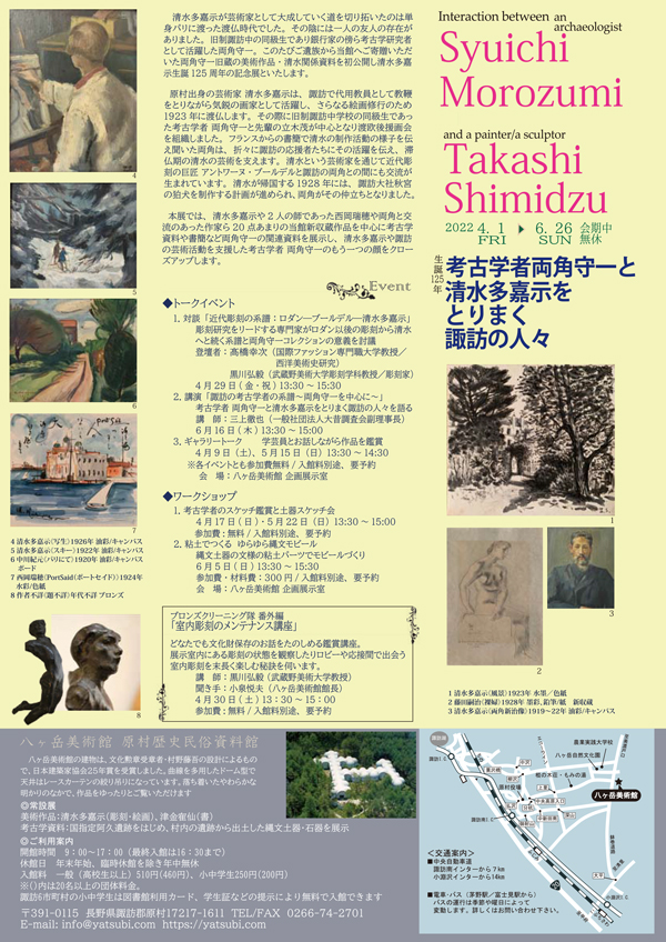 清水多嘉示が芸術家として大成していく道を切り拓いたのは、単身パリに渡った渡仏時代でした。その陰には一人の友人の存在がありました。旧制諏訪中の同級生であり銀行家の傍ら考古学研究者として活躍した両角守一。このたびご遺族から当館へご寄贈いただいた両角守一旧蔵の美術作品・清水関係資料を初公開し、清水多嘉示生誕125周年の記念展といたします。