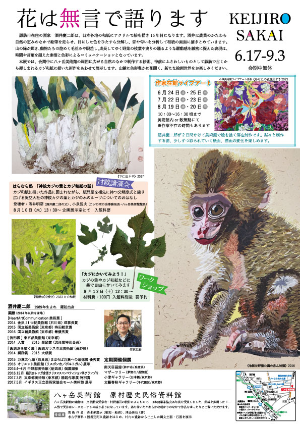 諏訪市在住の画家 酒井慶二郎は農業のかたわら、日本各地の和紙にアクリルで絵を描き16年目になります。酒井は、自然の恵みのなかで絵筆を走らせ、目にした色をひたすら分解し、音や匂いを分析して和紙の画面に描きとめていきます。山の緑が輝き、動物たちの煌めく毛並みや眼差し、成長してゆく野菜の枝葉や実りの踊るような躍動感を緻密に捉えた表現は、時間や言葉を超えた素描と色彩によるコミュニケーションとなっています。本展では、会期中に八ヶ岳美術館の周囲に広がる自然のなかで制作する絵画、神前にふさわしいものとして諏訪で古くから親しまれるカジ和紙に描いた新作をあわせて展示します。