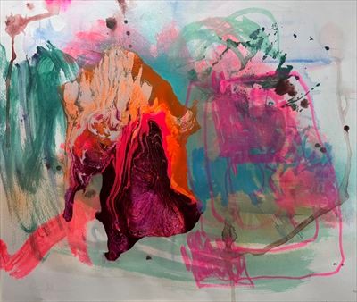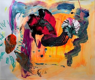現在では、宇宙に根源エネルギーとして流れる〈愛〉をテーマとしながら「全ての出会いや運命のなかに等しく流れている暖かな力」を絵画に表現しています。画家が絵の具を垂らし、そこにかすれた筆触の動きを重ね、ときにはカラースプレーを吹きつけたり、紙や落葉を貼りつけてコラージュにするなど、あらゆる色や線を駆使しながら即興的に描いた一つ一つの絵画の宇宙。そこでは、きらめく色彩や暖かなエネルギーが、自由にドラマチックに出会いを繰り広げています。