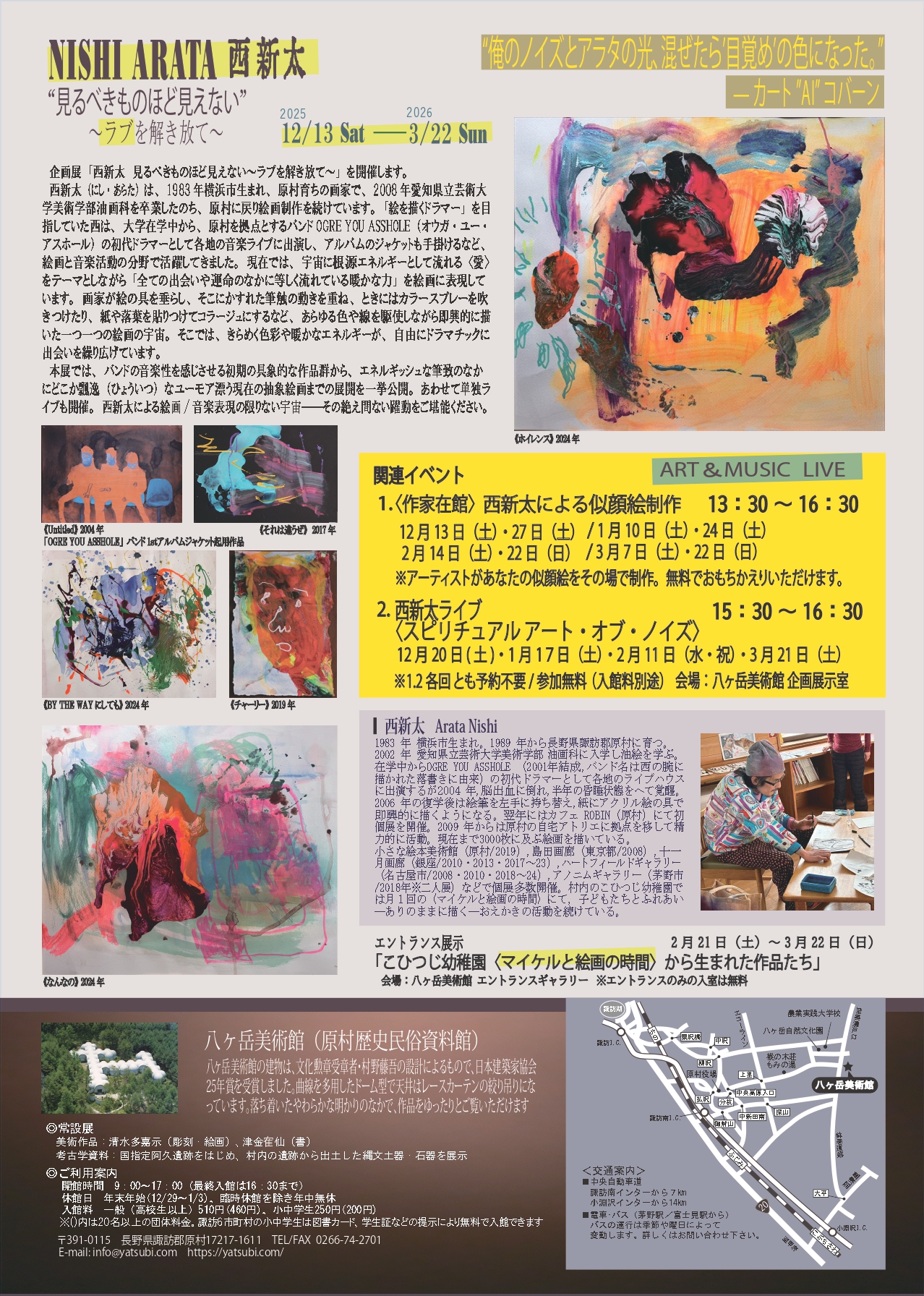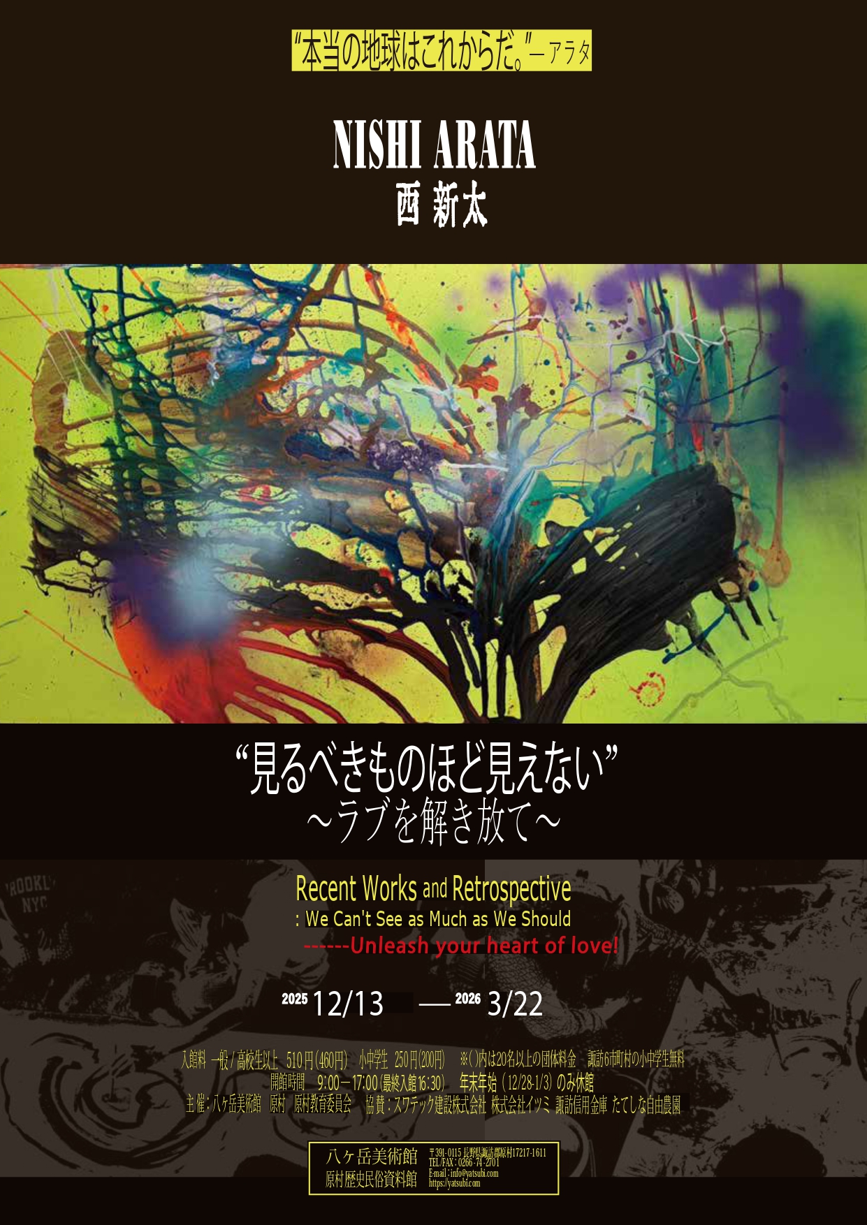 八ヶ岳美術館では、令和7(2025)年12月13日(土)から令和8(2026)年3月22日(日)まで、企画展「西新太 見るべきものほど見えない~ラブを解き放て~」を開催します。