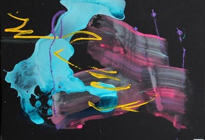 現在では、宇宙に根源エネルギーとして流れる〈愛〉をテーマとしながら「全ての出会いや運命のなかに等しく流れている暖かな力」を絵画に表現しています。画家が絵の具を垂らし、そこにかすれた筆触の動きを重ね、ときにはカラースプレーを吹きつけたり、紙や落葉を貼りつけてコラージュにするなど、あらゆる色や線を駆使しながら即興的に描いた一つ一つの絵画の宇宙。そこでは、きらめく色彩や暖かなエネルギーが、自由にドラマチックに出会いを繰り広げています。
